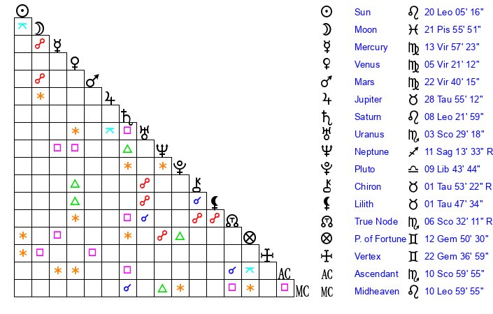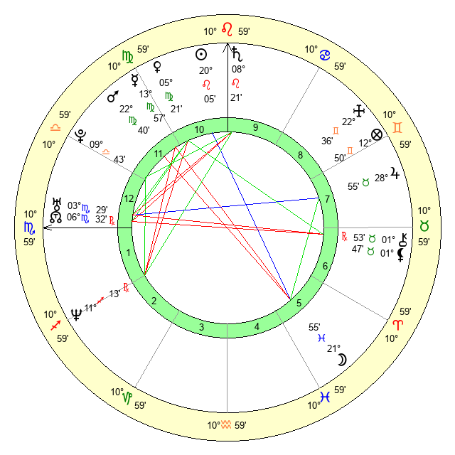 | Mercury | 13 Virgo 57 | 4 Leo 21 | 23 Virgo 9 |