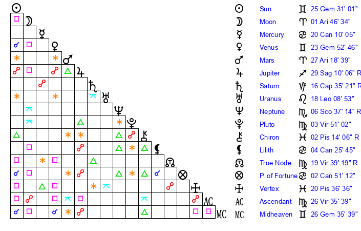 | Mars | 27 Aries 19 | 29 Leo 38 | 11 Gemini 57 |