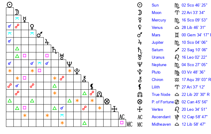 | Neptune | 4 Scorpio 27 | 29 Pisces 53 | 6 Scorpio 34 |