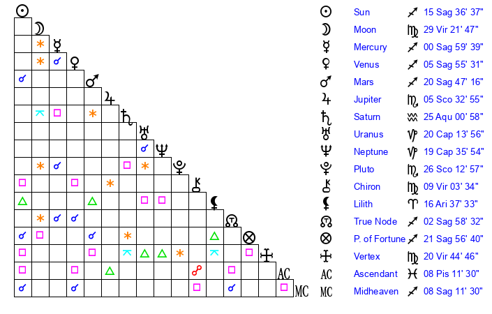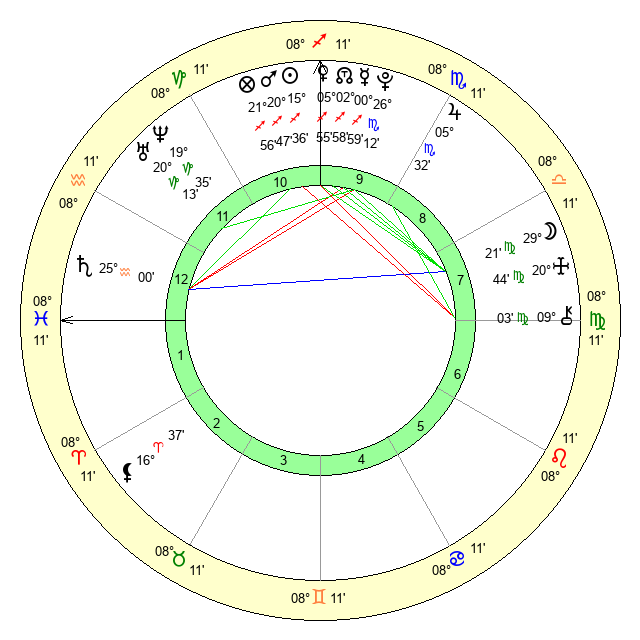 | Moon | 29 Virgo 22 | 4 Pisces 6 | 22 Scorpio 41 |