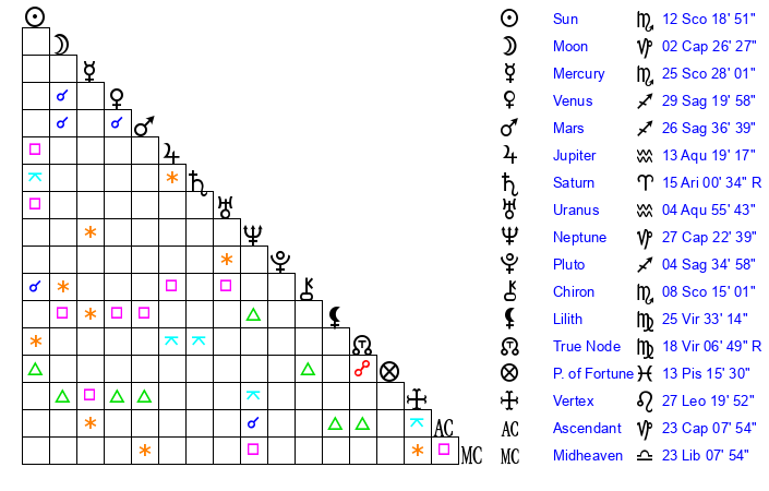 Sun | 12 Scorpio 19 | 12 Scorpio 46 | 9 Sagittarius 33 |