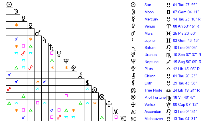 | Sun | 1 Taurus 28 | 1 Taurus 50 | 17 Gemini 46 |
