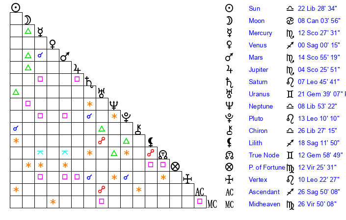 | Mercury | 12 Scorpio 28 | 14 Scorpio 4 | 0 Capricorn 36 |