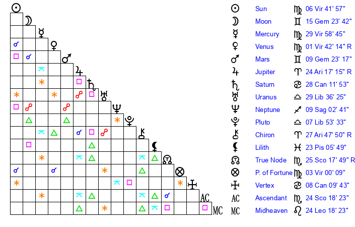 | Sun | 6 Virgo 42 | 7 Virgo 34 | 25 Libra 41 |