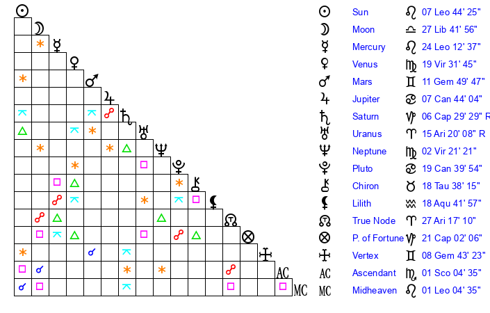| Mercury | 24 Leo 13 | 9 Leo 12 | 8 Scorpio 26 |