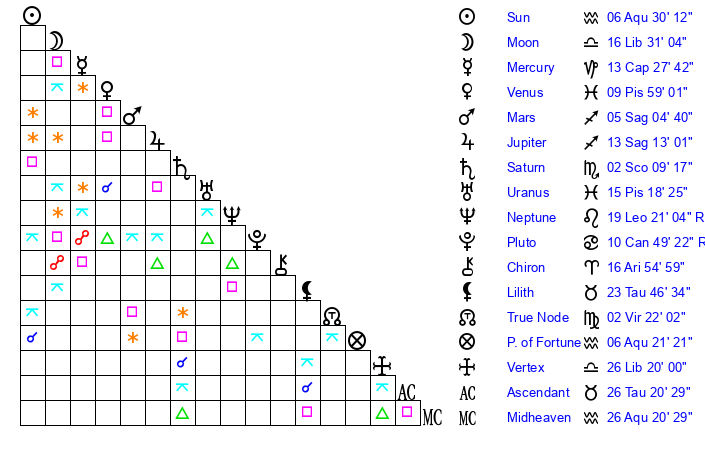 | Moon | 16 Libra 29 | 14 Capricorn 55 | 27 Gemini 45 |