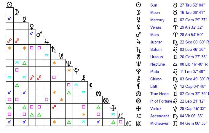 | Mars | 28 Aries 56 | 14 Leo 40 | 24 Gemini 34 |