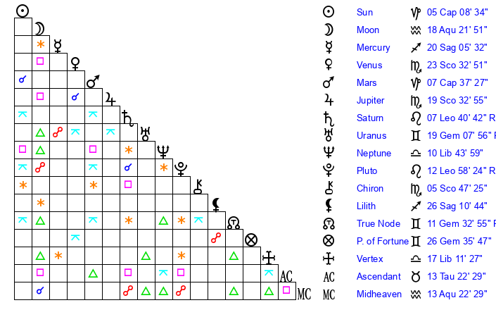 | Neptune | 10 Libra 44 | 27 Pisces 14 | 9 Libra 51 |