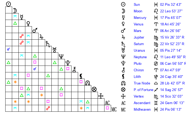 | Sun | 2 Pisces 32 | 3 Pisces 19 | 14 Gemini 27 |