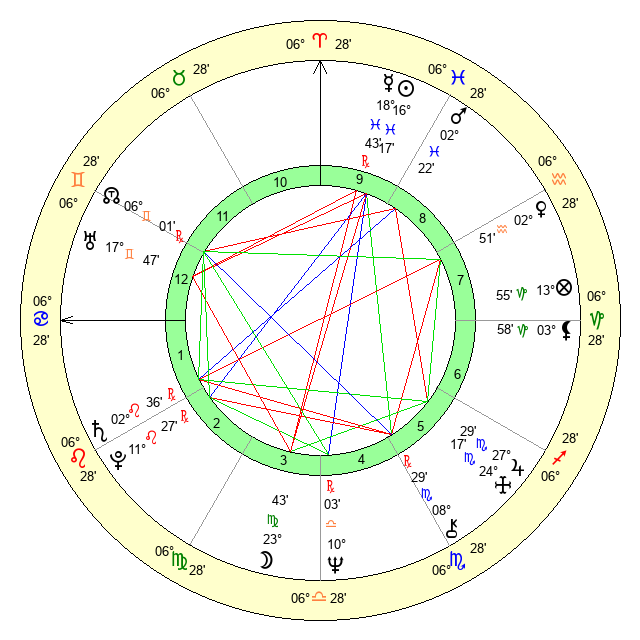 | Moon | 23 Virgo 46 | 0 Cancer 21 | 29 Cancer 52 |