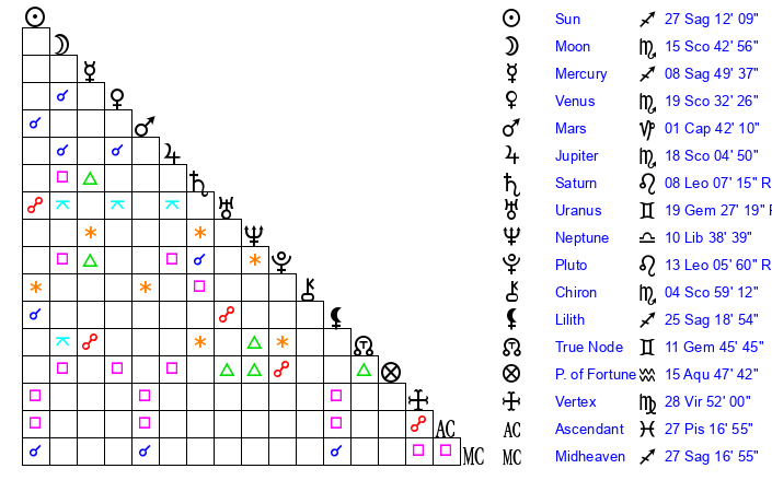 | Sun | 27 Sagittarius 12 | 28 Sagittarius 2 | 17 Pisces 17 |