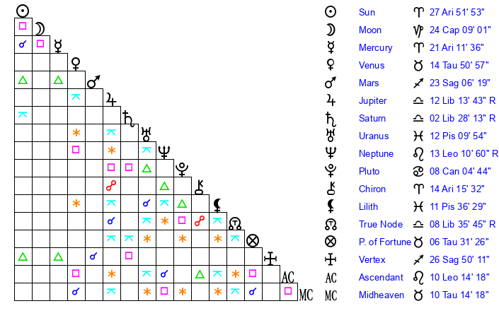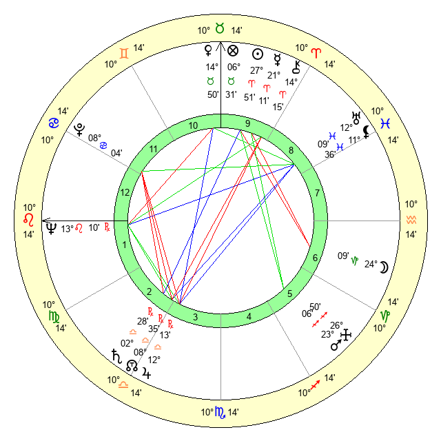 | Neptune | 13 Leo 10 | 0 Aries 41 | 15 Leo 21 |