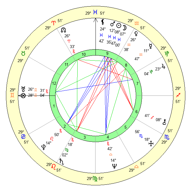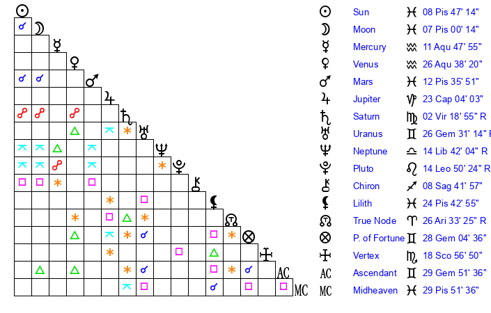 | Moon | 6 Pisces 55 | 4 Pisces 55 | 22 Sagittarius 34 |