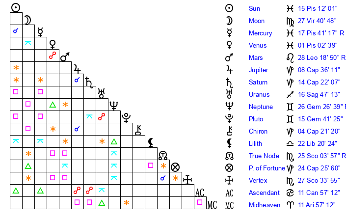 | Moon | 27 Virgo 36 | 13 Gemini 11 | 6 Aries 33 |