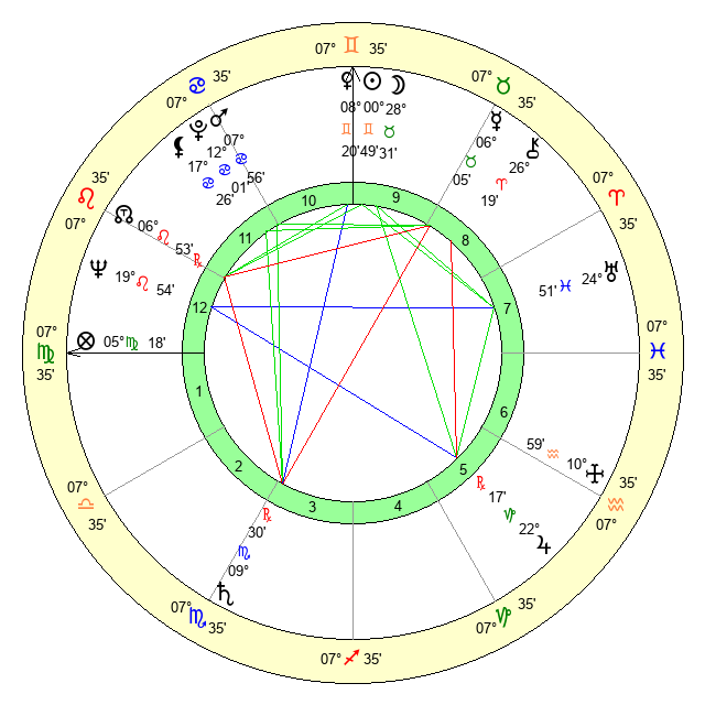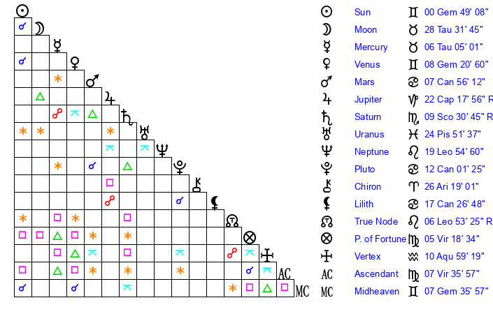 | Sun | 0 Gemini 49 | 1 Gemini 37 | 6 Virgo 32 |