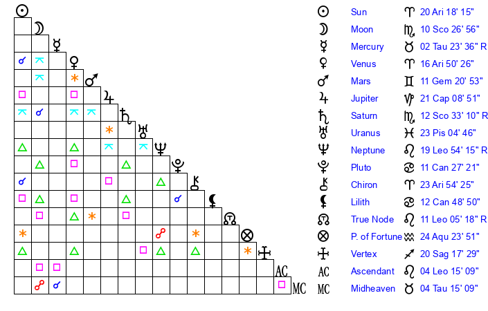 | Venus | 16 Aries 51 | 24 Pisces 45 | 19 Leo 39 |