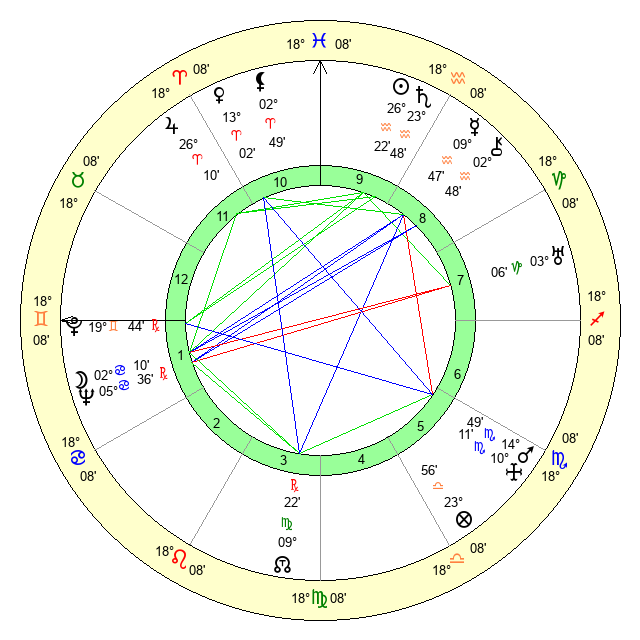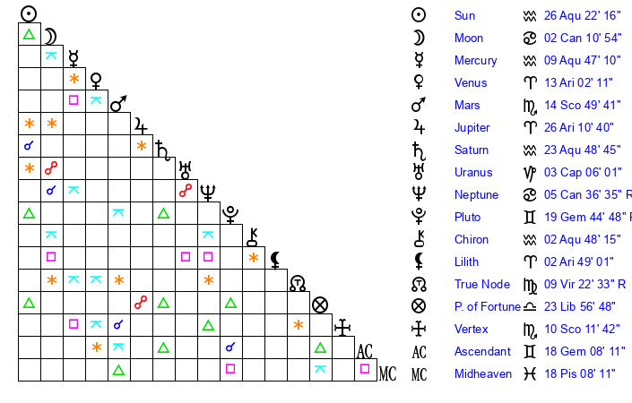 | Sun | 26 Aquarius 22 | 27 Aquarius 16 | 23 Gemini 53 |