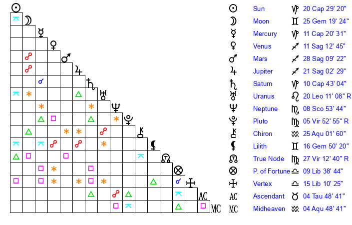 | Jupiter | 20 Sagittarius 56 | 12 Gemini 12 | 1 Capricorn 41 |