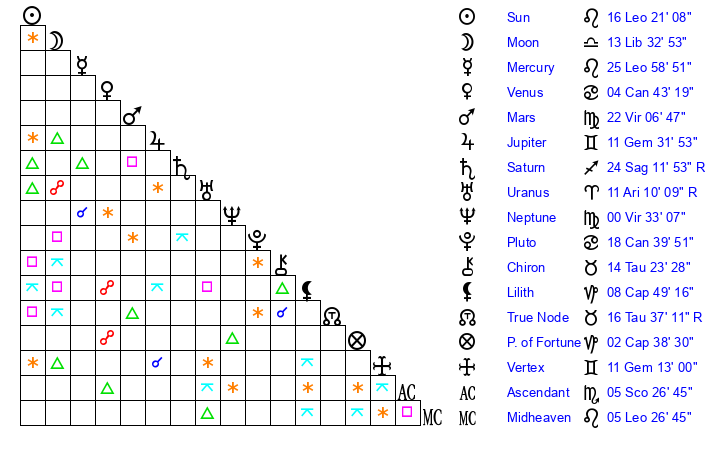 | Mercury | 25 Leo 59 | 4 Leo 26 | 12 Scorpio 21 |