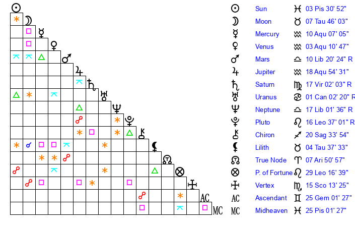 | Neptune | 17 Libra 1 | 28 Pisces 40 | 15 Libra 9 |