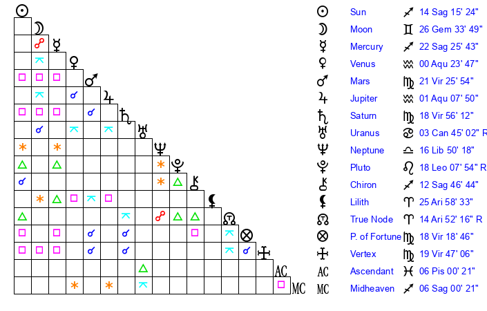 | Neptune | 16 Libra 50 | 29 Pisces 22 | 17 Libra 3 |