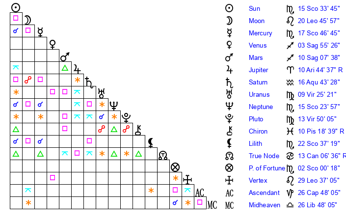 | Neptune | 15 Scorpio 24 | 29 Pisces 38 | 17 Scorpio 23 |