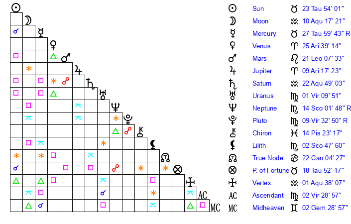 | Moon | 10 Aquarius 11 | 25 Sagittarius 26 | 24 Taurus 51 |