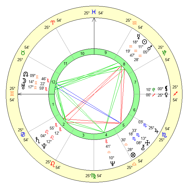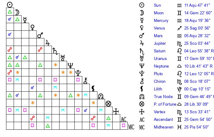 | Moon | 14 Gemini 39 | 22 Pisces 0 | 20 Aries 44 |