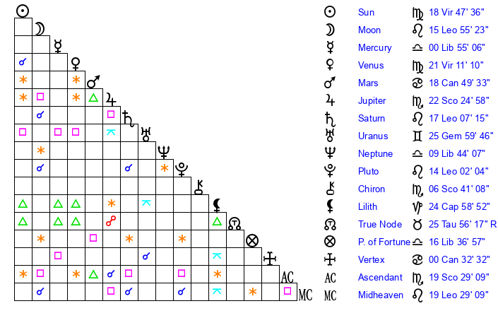 | Venus | 21 Virgo 12 | 21 Leo 20 | 28 Sagittarius 26 |