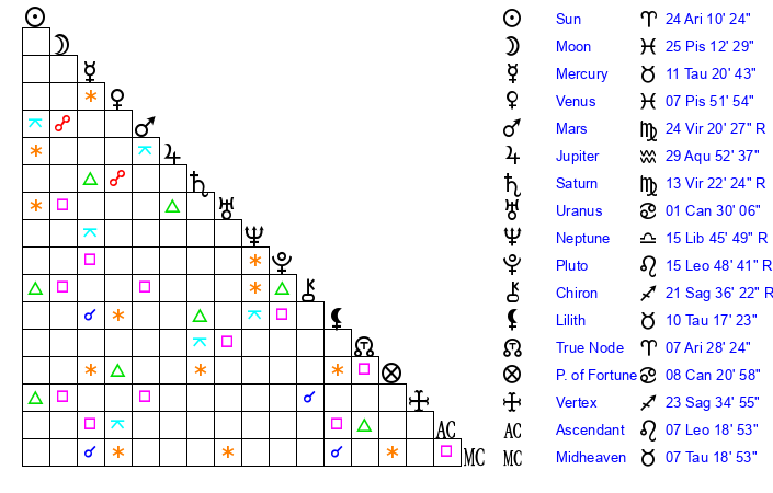| Saturn | 13 Virgo 56 | 26 Pisces 0 | 14 Virgo 43 |