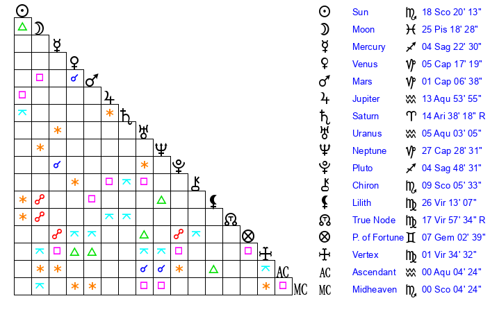 | Sun | 18 Scorpio 20 | 18 Scorpio 33 | 16 Sagittarius 39 |
