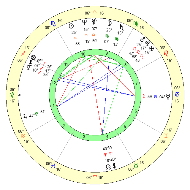 | Moon | 25 Virgo 9 | 6 Libra 28 | 5 Cancer 23 |