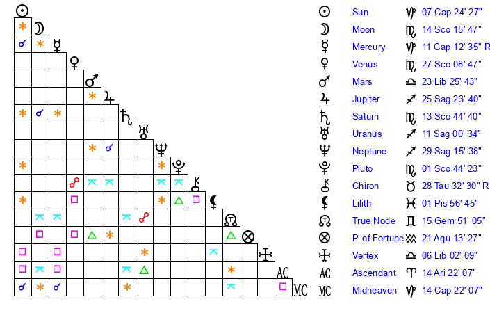 | Moon | 14 Scorpio 12 | 23 Sagittarius 43 | 2 Taurus 28 |
