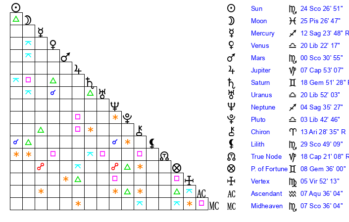 | Sun | 24 Scorpio 26 | 24 Scorpio 35 | 18 Capricorn 17 |