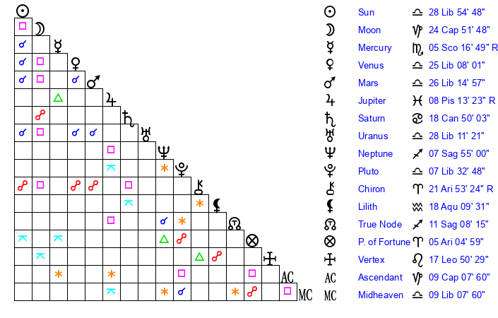 | Moon | 24 Capricorn 58 | 12 Scorpio 33 | 8 Sagittarius 44 |