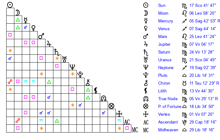 | Sun | 17 Scorpio 42 | 18 Scorpio 33 | 4 Capricorn 19 |