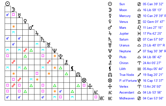 | Sun | 5 Cancer 39 | 6 Cancer 18 | 24 Leo 23 |