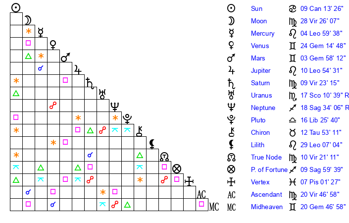 Moon | 28 Virgo 20 | 27 Virgo 25 | 15 Gemini 45 |
