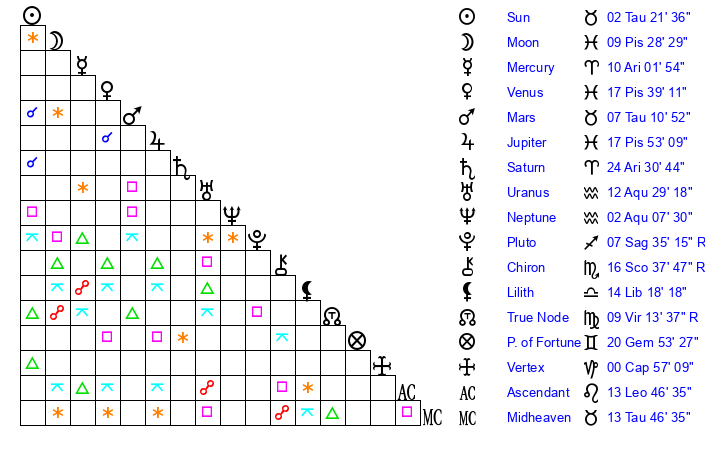 | Saturn | 24 Aries 19 | 26 Pisces 53 | 27 Aries 36 |