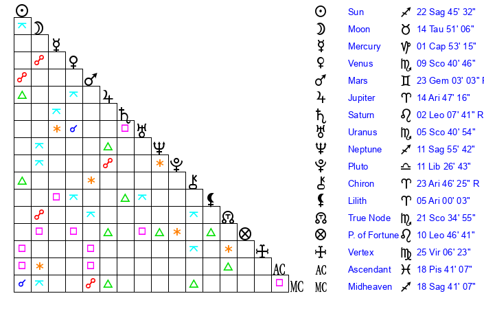 Moon | 14 Taurus 53 | 23 Gemini 55 | 6 Pisces 43 |