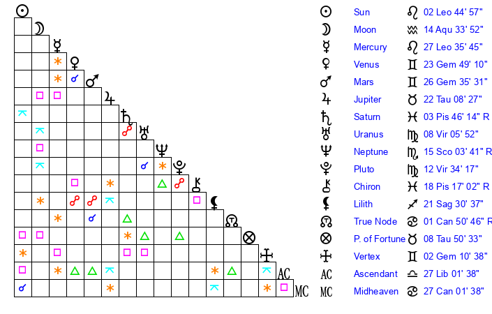 | Moon | 14 Aquarius 41 | 14 Leo 26 | 9 Taurus 57 |