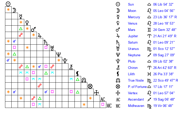 | Neptune | 9 Sagittarius 26 | 0 Aries 32 | 10 Sagittarius 57 |