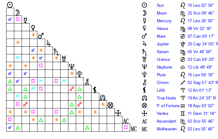 | Moon | 25 Scorpio 10 | 23 Scorpio 31 | 25 Leo 59 |