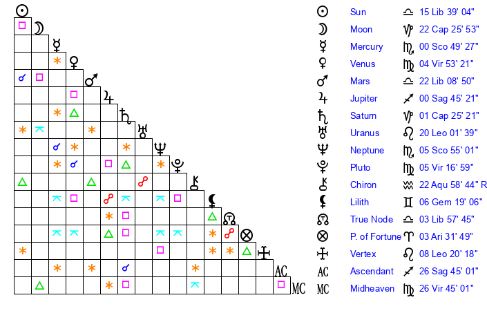 | Sun | 15 Libra 39 | 16 Libra 39 | 21 Sagittarius 57 |