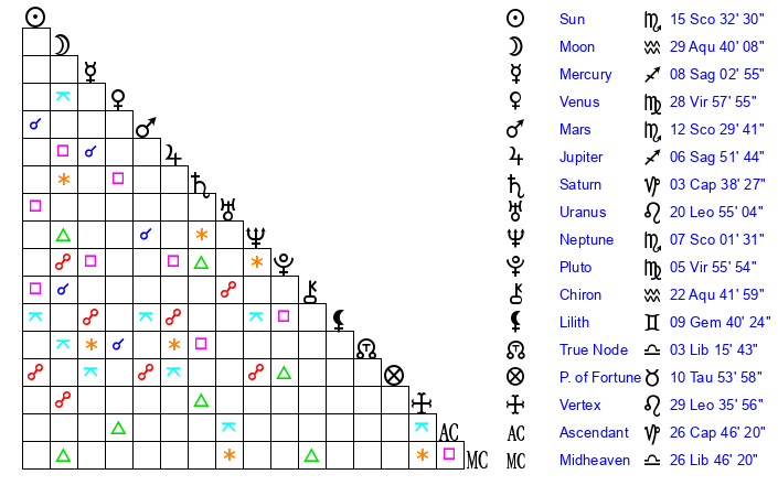 | Sun | 15 Scorpio 32 | 16 Scorpio 32 | 22 Capricorn 31 |