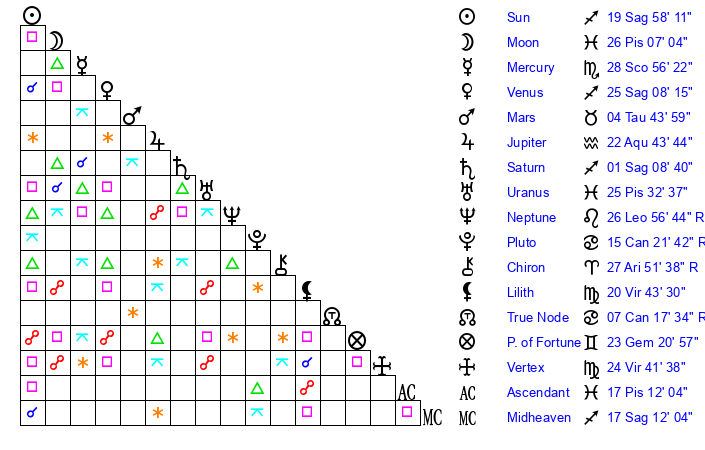 | Saturn | 1 Sagittarius 34 | 25 Pisces 15 | 8 Sagittarius 5 |