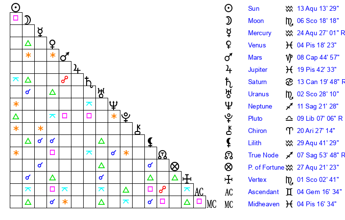 | Sun | 13 Aquarius 14 | 14 Aquarius 6 | 3 Aries 26 |