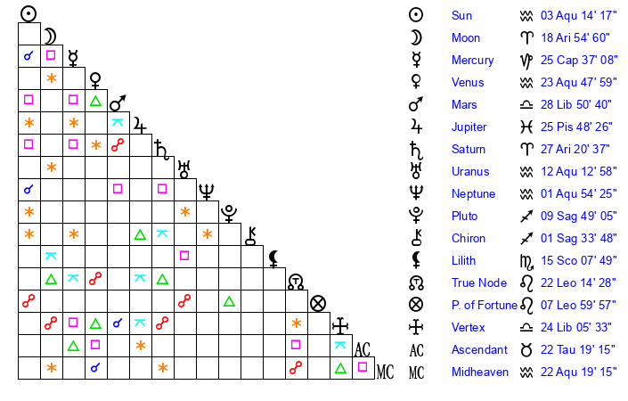 | Moon | 18 Aries 56 | 24 Scorpio 1 | 1 Aries 5 |