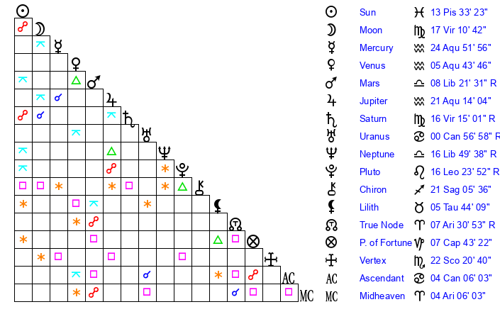| Saturn | 16 Virgo 49 | 21 Pisces 4 | 13 Virgo 7 |