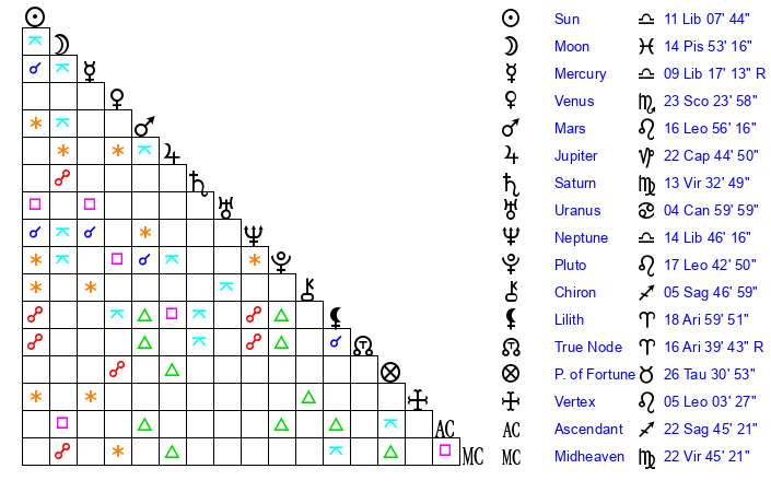 | Moon | 14 Pisces 52 | 8 Pisces 37 | 26 Sagittarius 28 |